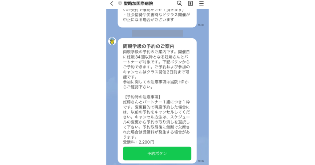 その際に出産予定日も登録するため、両親学級に参加できる週数の近くになるとLINEで案内がきます。